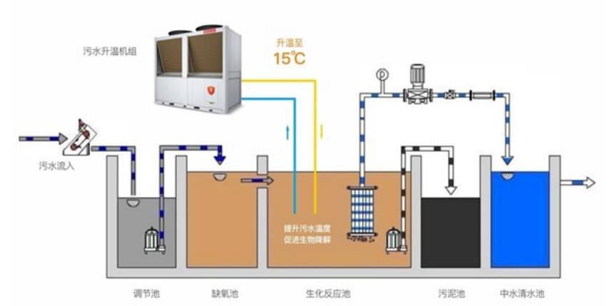 為了響應國家整改號召、同時降低污水處理廠的運營成本,內蒙古阿拉善騰格里沙漠污水處理的領導經研究決定拆除當時正在使用的德國進口機組,用空高溫氣能熱泵設備來替代提供污水處理所需的熱能,同時對整個處理過程中的余熱進行回收再利用。